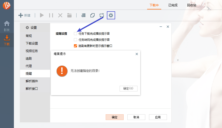 修改配置,例如不要下载时的声音,提示“无法创建指定的目录”