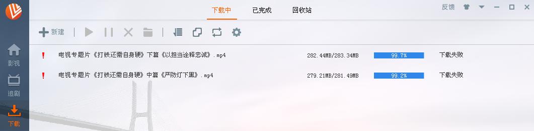 http://tv.people.com.cn/n1/2017/0104/c61600-28999286.html下载到99.2%,http://tv.people.com.cn/n1/2017/0105/c61600-29002236.html下载到99.7%就显示下载失败,多次。
