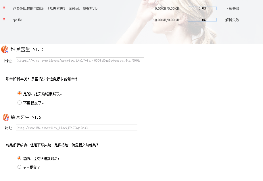您好! http://www.56.com/u41/v_MTAwMjY4OTAy.html 能够解析,但是下载失败 https://v.qq.com/iframe/preview.html?vid=y0307a0qg6b&width=500&height=375&auto=0 解析不了,也下载不了,但可以在浏览器中播放